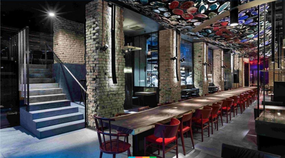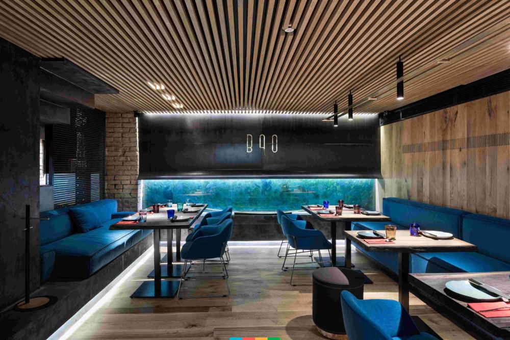 Інтер'єр ресторану — це втілення сучасної естетики Гонконгу, Сінгапуру та Нью-Йорка, де традиції зустрічаються з модерном. Ви зможете насолодитися трапезою за барною стійкою або обрати столик біля панорамних вікон для затишних компаній. Основний зал вражає грандіозним комунальним столом, найдовшим у Східній Європі, і неймовірною інсталяцією — хвіст дракона, що занурюється у воду, плавно переходить у водоспад, додаючи атмосфері магії та динаміки.